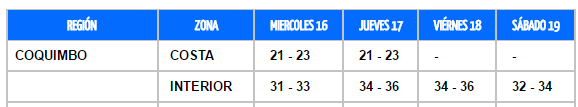 El reporte indica que en la costa de Coquimbo las máximas fluctuarán entre los 21 y 23 grados Celsius, mientras que en el interior variarán entre los 31° y 36°C. La Recomendación es a hidratarse bien y usar bloqueador solar.…