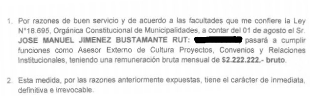 En la orden de servicio firmada por el alcalde Marcelo Pereira se expone que “por razones de buen servicio” a partir del 1 de agosto Jiménez “pasará a cumplir funciones como asesor externo de Cultura, Proyectos, Convenios y Relaciones Institucionales, teniendo una remuneración bruta mensual de $2.222.222 bruto”.