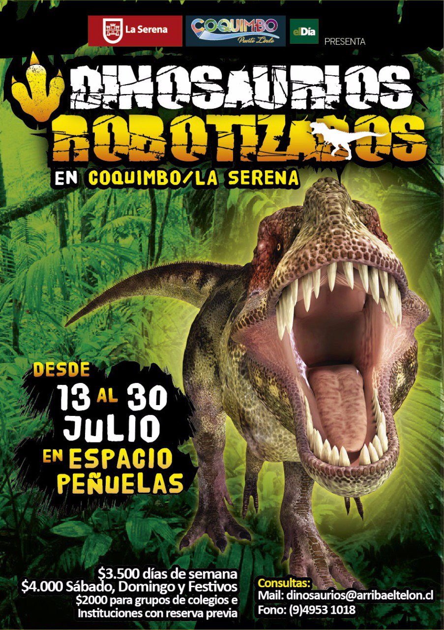 Desde el 13 al 30 de Julio se instalará en Espacio Peñuelas la exposición de dinosaurios animatrónicos. El valor de las entradas es de $3.500 de Lunes a Viernes y de $4.000 los fines de semana. (adsbygoogle = window.adsbygoogle || []).push({});