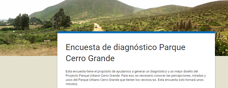 El serviu a través de su plataforma web a incluido un formulario de consulta ciudadana para recopilar ideas y opiniones sobre el diseño del nuevo parque urbano en el Cerro grande. (adsbygoogle = window.adsbygoogle || []).push({}); Puedes responder entrando al siguiente enlace: HAZ CLICK ACÁ PARA RESPONDER